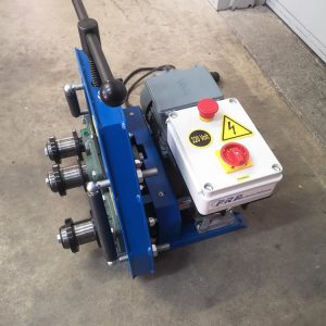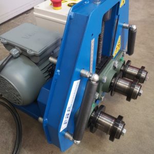 Cintreuse à double entrainement , le moto-réducteur actionne les deux rouleaux inférieurs qui entrainent le profilé entre les trois rouleaux.